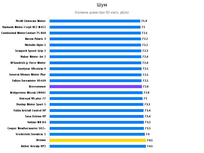 Громкость шума измерялась снаружи автомобиля, отличия по уровню шума в салоне будут незначительными, хотя более жёсткие летние шины шумят громче зимних.